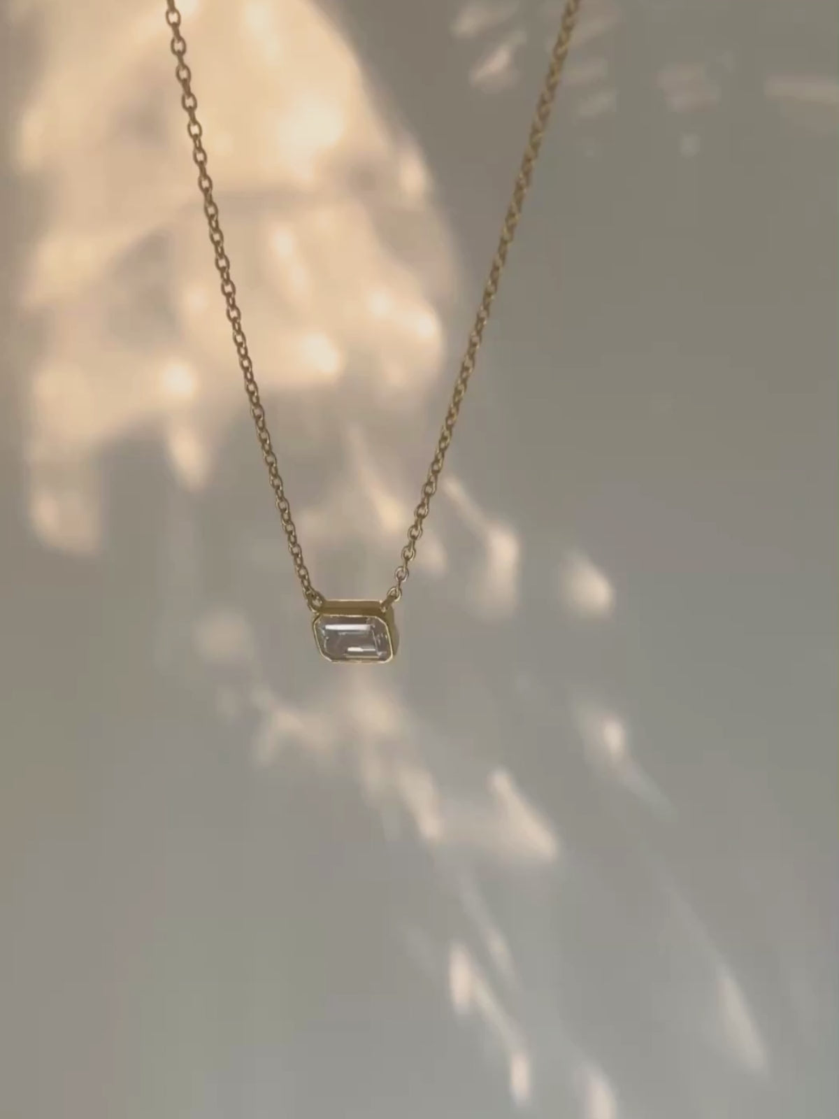 Dainty 18K gold plated chain with rectangular emerald cut moissanite stone pendant set horizontally.