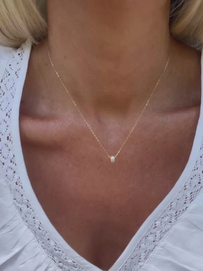 Fine gold chain with circle charm, embedded with emerald cut stones around full circumference. Trigger clasp fastening.