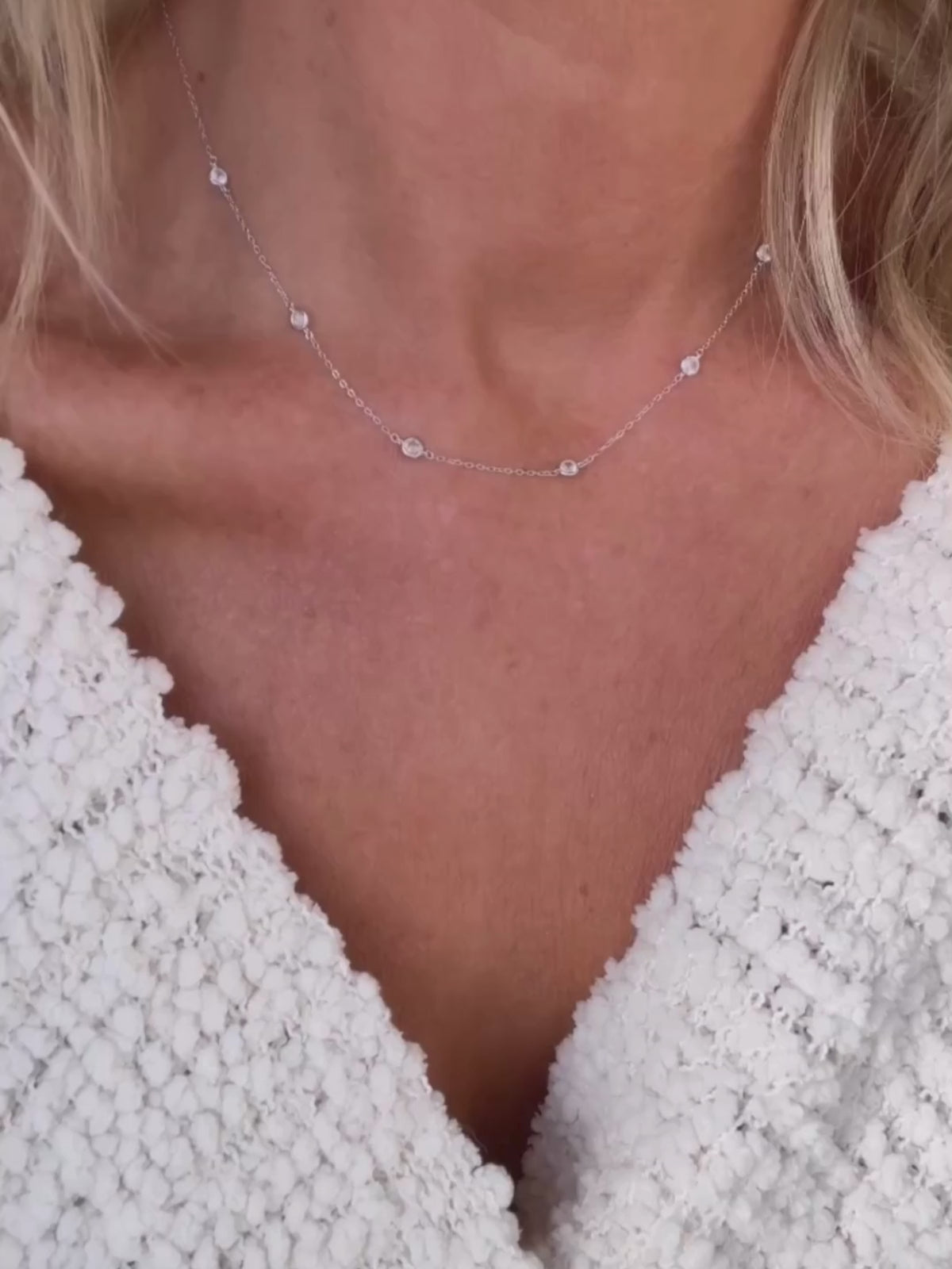 Fine silver necklace with six 3mm cubic zirconia stones set into the chain. Trigger clasp fastening.