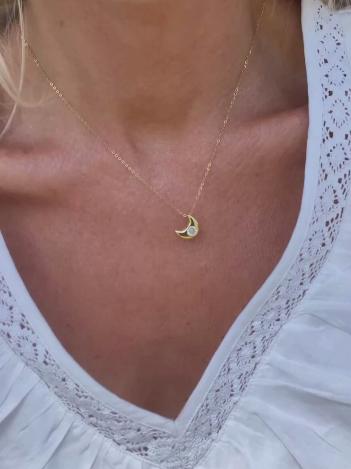 Smooth, raised moon shaped pendant with solitaire round stone. Pendant can be strung in many different ways due to the large openings at the back.
